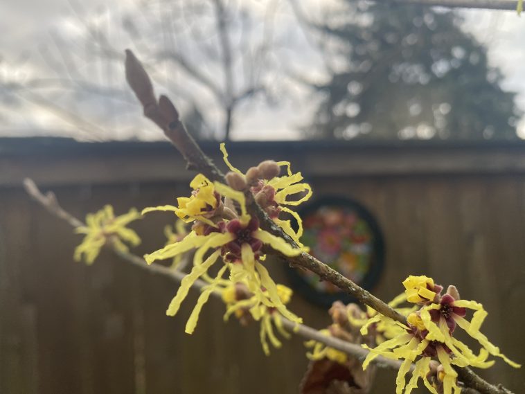 And the witch hazels are blooming in our backyard habitat garden. Crimson, fire-engine red, and this sunny, cheerful yellow. I just learned that the North American species of this shrub are occasionally called winterbloom because (obviously) that is when they come into flower. Good for them for cheering us on to spring. I suspect more than a few of us need such harbingers now. Saturday we did not, for the first time in forever, march in that anti-ICE rally that ended up being tear-gassed and flash-banged down in southwest Portland as they peacefully made their way to the building ICE rents on Macadam Avenue